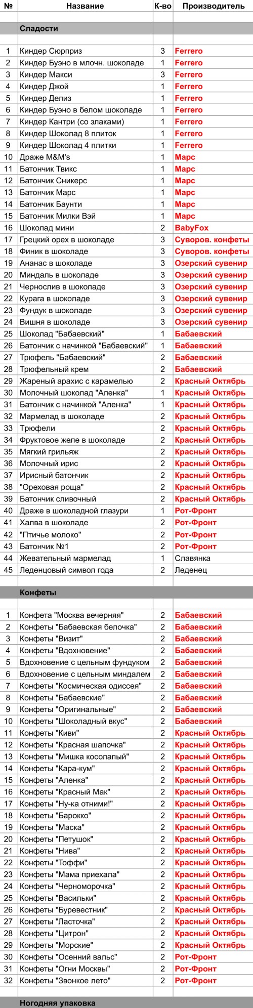 Жареный арахис с карамелью (2 шт), Молочный шоколад "Аленка" (1 шт), Батончик с начинкой "Аленка" (1 шт), Мармелад в шоколаде (2 шт), Трюфели (2 шт), Фруктовое желе в шоколаде (2 шт), Мягкий грильяж (2 шт), Конфеты "Киви" (2 шт), Конфеты "Красная шапочка" (2 шт), Конфеты "Мишка косолапый" (2 шт), Конфеты "Кара-кум" (2 шт), Конфеты "Аленка" (2 шт), Конфеты "Красный Мак" (2 шт), Конфеты "Ну-ка отними!" (2 шт), Конфеты "Барокко" (2 шт), Конфеты "Маска" (2 шт), Конфеты "Петушок" (2 шт), Конфеты "Нива" (2 шт), Конфеты "Toффи" (2 шт), Конфеты "Мама приехала" (2 шт), Конфеты "Черноморочка" (2 шт), Конфеты "Васильки" (2 шт), Конфеты "Буревестник" (2 шт), Конфеты "Ласточка" (2 шт), Конфеты "Цитрон" (2 шт), Конфеты "Морские" (2 шт), Молочный ирис (2 шт), Ирисный батончик (2 шт), "Ореховая роща" (2 шт), Батончик сливочный (2 шт)